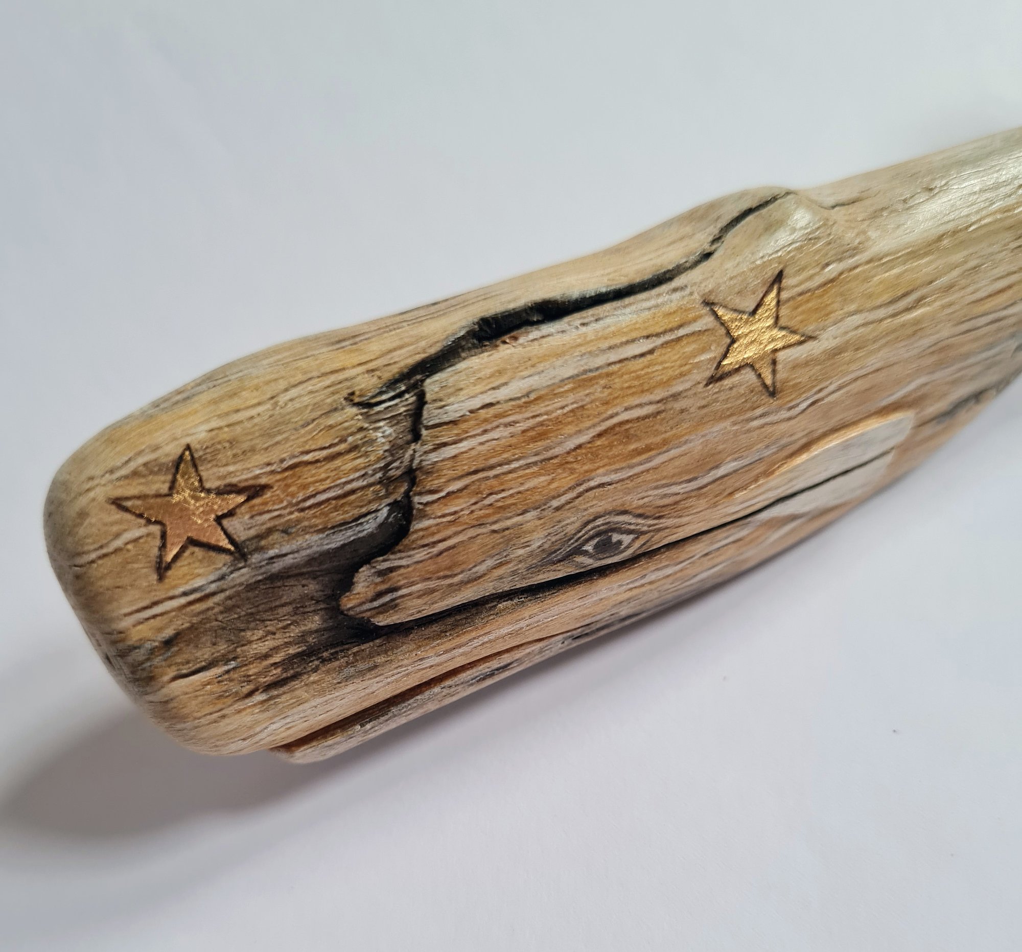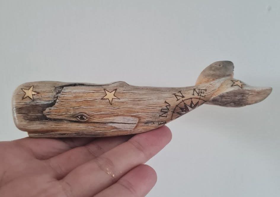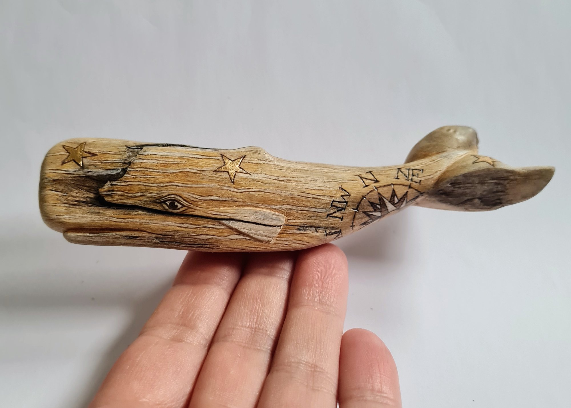 Each whale is unique and follows the shape and charater of the driftwood. Red is especially characterful featuring a large battle scar and beautiful knotwork on her tail.