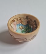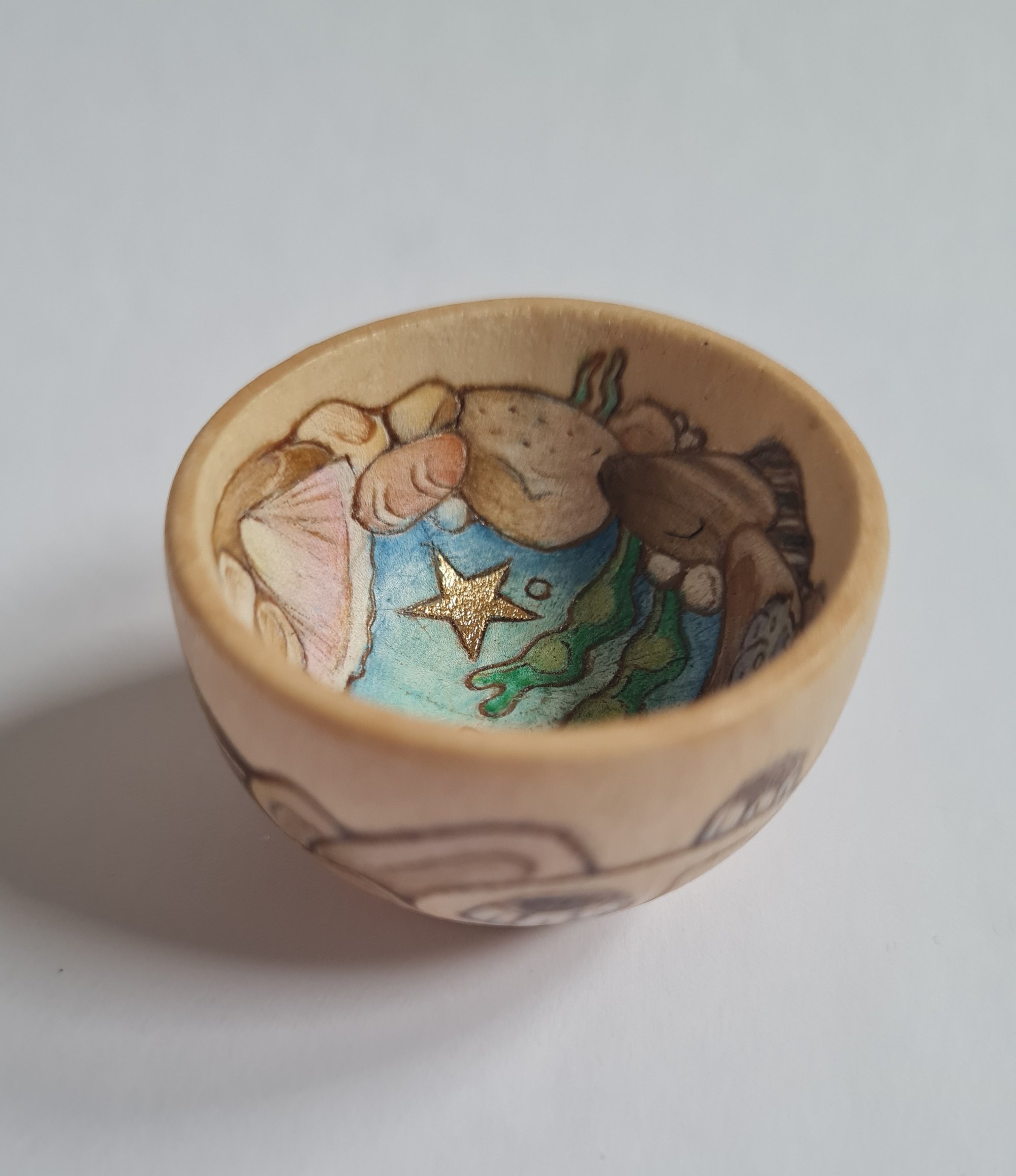 Wooden bowl with handburned interior and exterior, finished with colour, gold leaf detail.