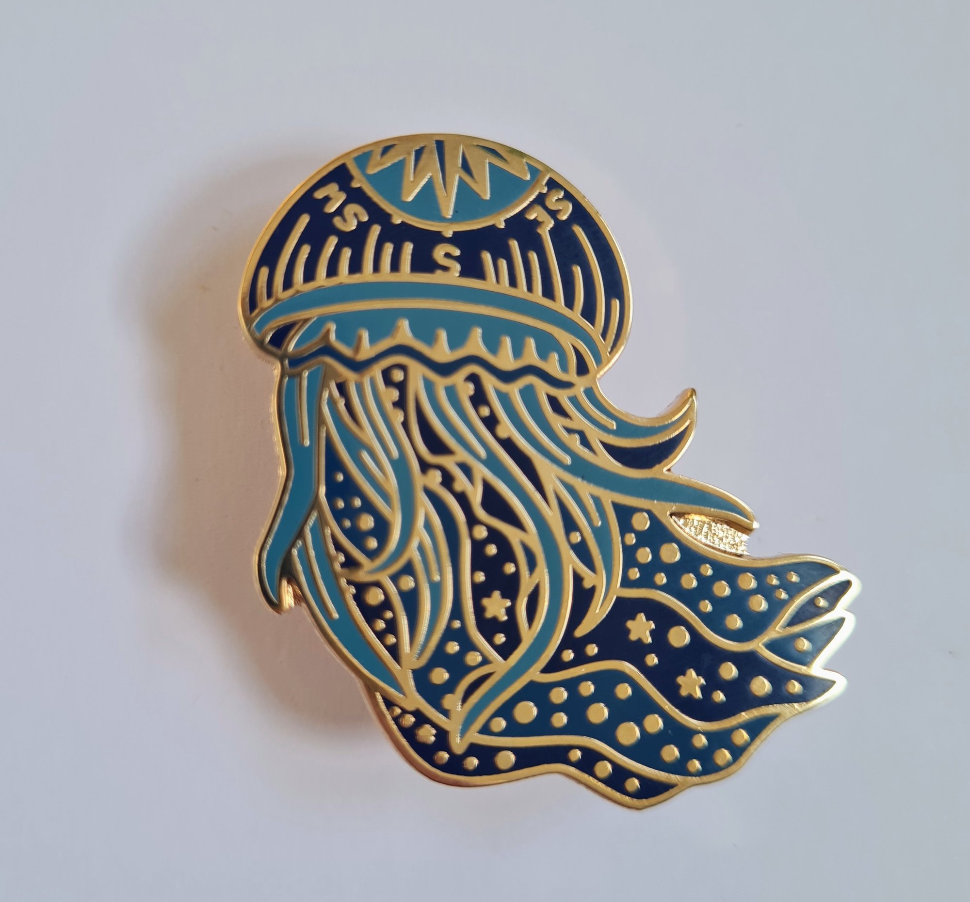 A brand new pin design in this series, fresh from the latest Treasure Box...highly polished gold effect metal with blue enamel in-fills in different shades featuring a galactic star studded jellyfish.
