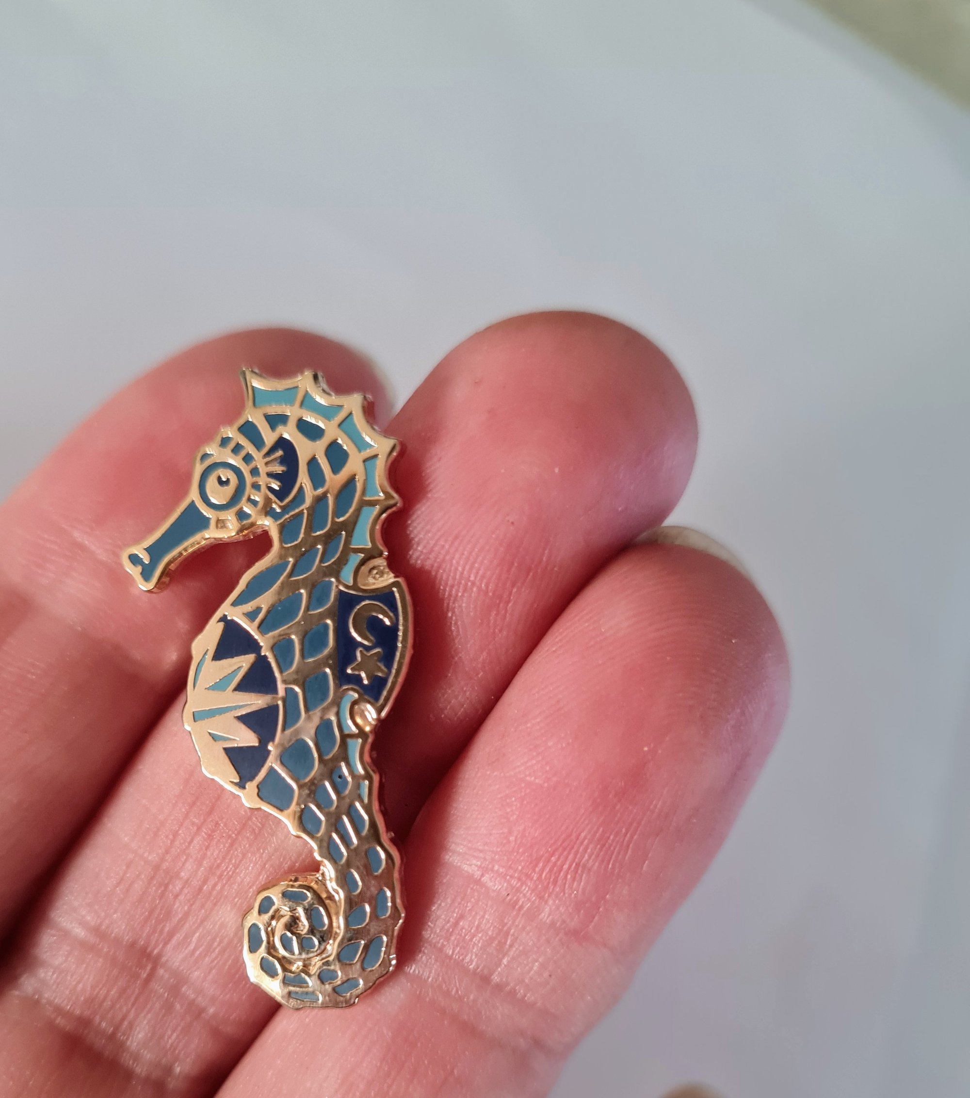 A brand new pin design in this series, fresh from the latest Treasire Box...highly polished gold effect metal with blue enamel in-fills in different shades featuring a magificent little seahorse.