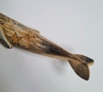 Luca lies flat with his tail flipped up into the air, sort of like a lazy banana (no offense Luca) and the wood has a pretty ombre effect - he would look especially lovely if you could display him on vertical surface.