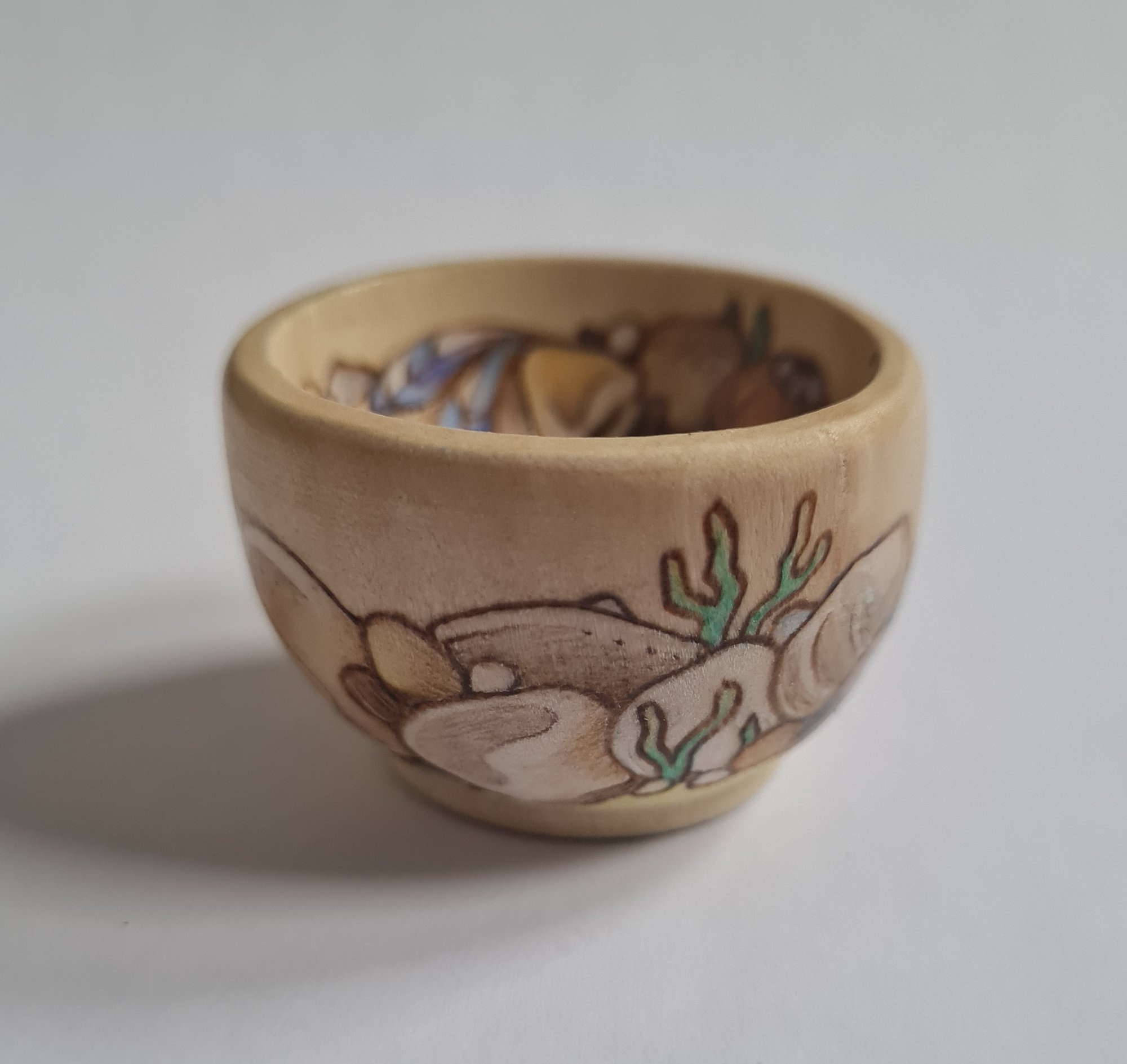 Wooden bowl with handburned interior and exterior, finished with colour, gold leaf detail.